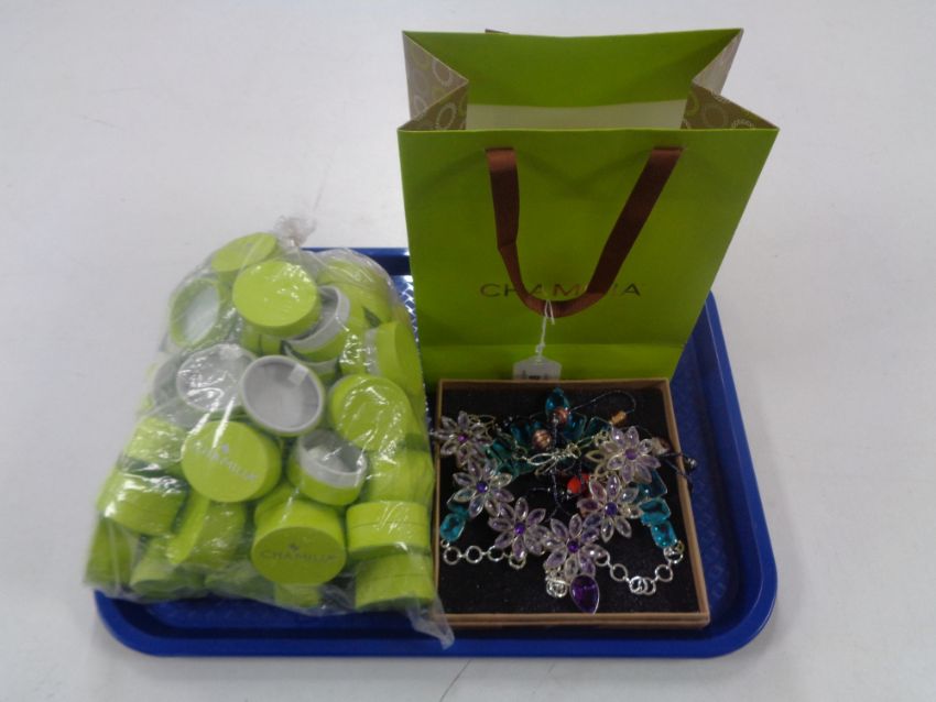 A quantity of Chamilia ring boxes, heavy white metal necklaces and gift bag.