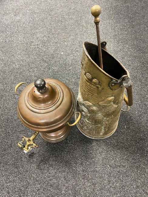 An antique copper and brass tea urn together with a brass embossed coal receiver with fire poker.