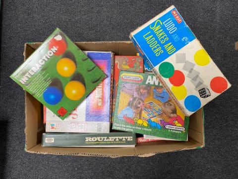 A box containing vintage board games by Merit, Waddingtons etc.