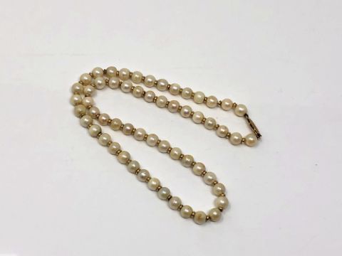 A pearl necklace with gold spacers and clasp.