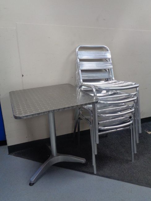 A pair of square topped metal pedestal bistro tables together with four stacking chairs