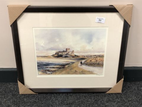 After Tom MacDonald : Bamburgh Castle, reproduction in colours, signed in pencil, 21 cm by 30 cm, framed.