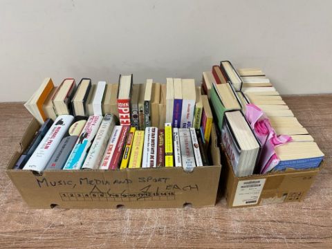 Two boxes containing hardback and paperback volumes to include novels, autobiographies etc.