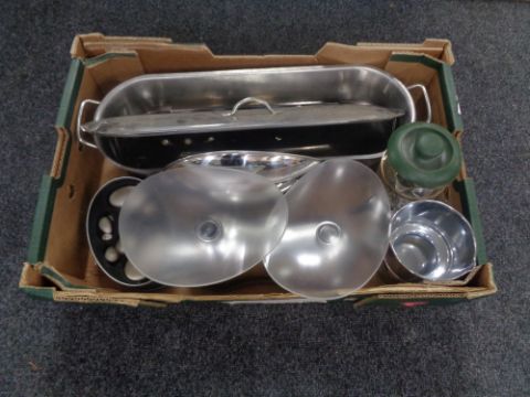 A box containing kitchenalia to include stainless steel fish kettle, Equilibrium kitchen scales with weights, caffetiere etc.