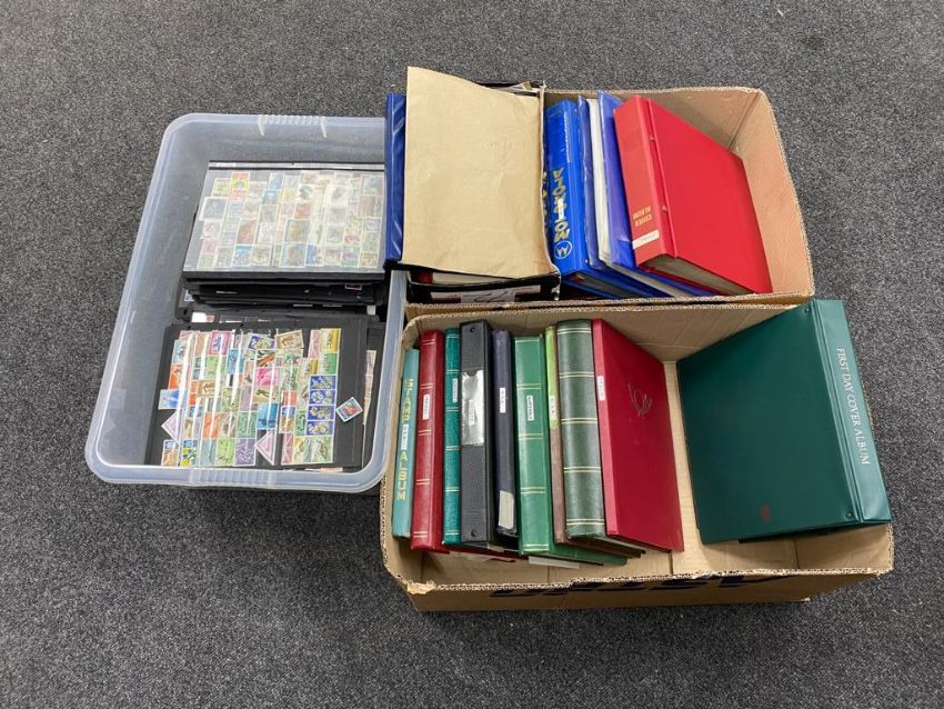 Two boxes and a crate containing a large quantity of first day covers and world stamps in albums.