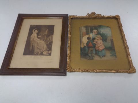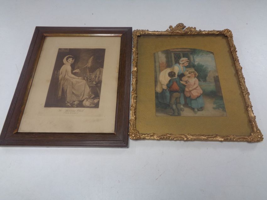 Two antique framed prints, Spinning wheel and Lady Hamilton, together with one other.