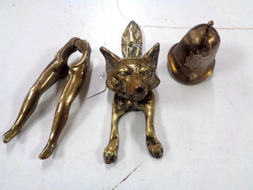 A Victorian brass fox door knocker, together with brass 'legs' nut cracker and Police helmet table bell. (3)