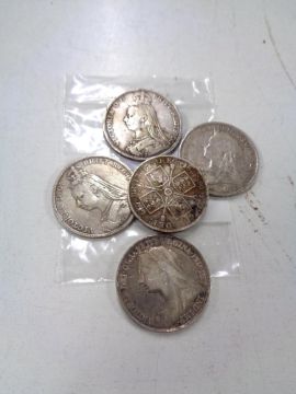 Four Victorian silver Crowns together with an 1890 Victorian silver florin. (5)