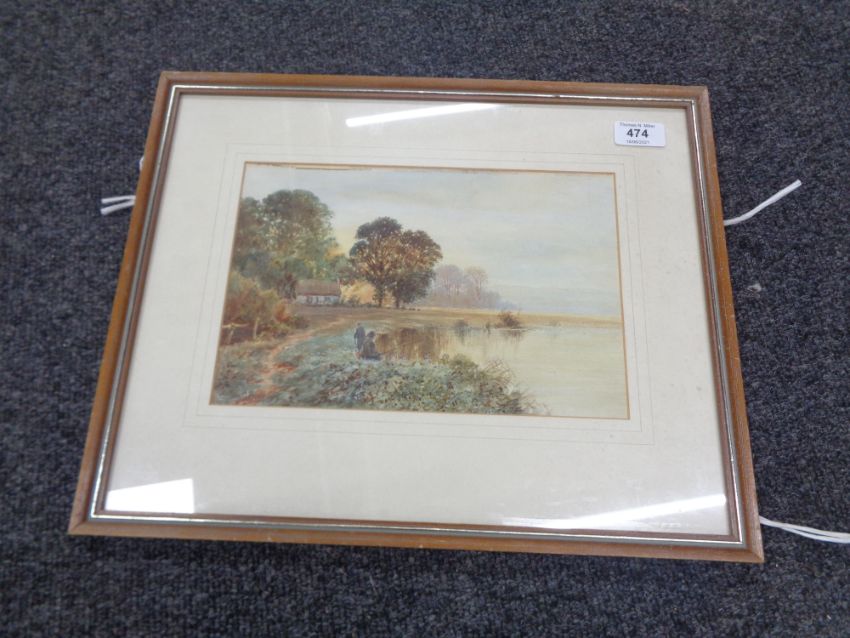 An early 20th century John W Hepple watercolour, figures fishing by a lake with dwelling beyond.