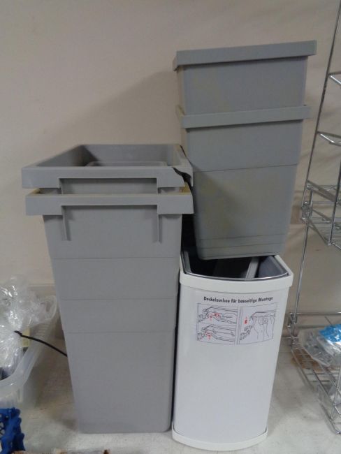 A quantity of assorted bins together with a wire metal kitchen cabinet storage rack and wine rack.
