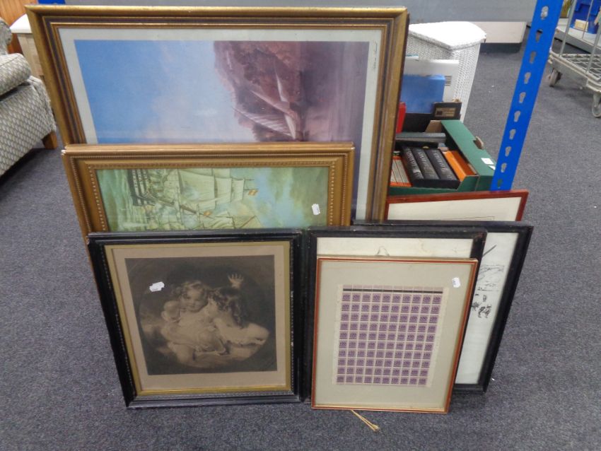 A J. W. Carmichael print, Salute on Arrival, together with six other assorted framed pictures and a set of framed German stamps.