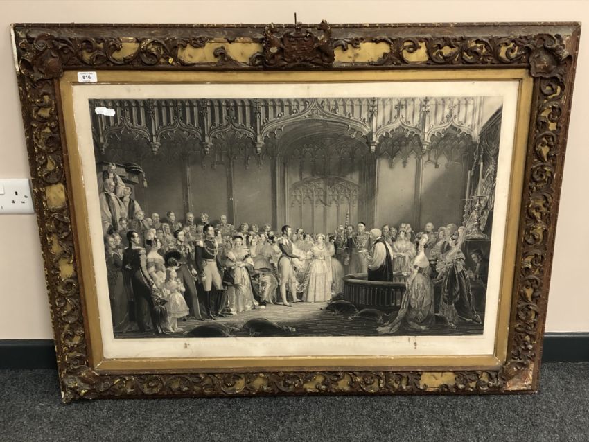 A 19th century monochrome print : The Marriage of Her Most Gracious Majesty Queen Victoria, in an ornate frame, 92 x 64 cm.