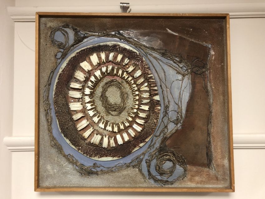 Ann Gillie, Dragon Flower 2, oil, animal teeth and collage on board, 55 x 50 cm, framed.