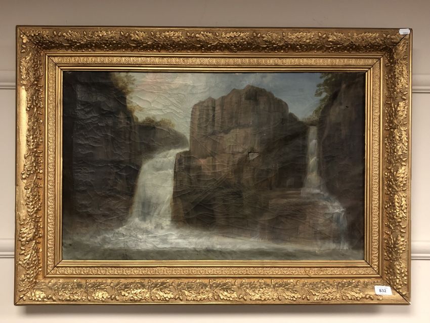 A 20th century school : A waterfall, oil on canvas, 72 x 45 cm, framed.