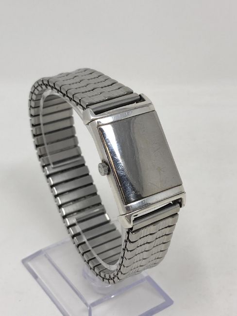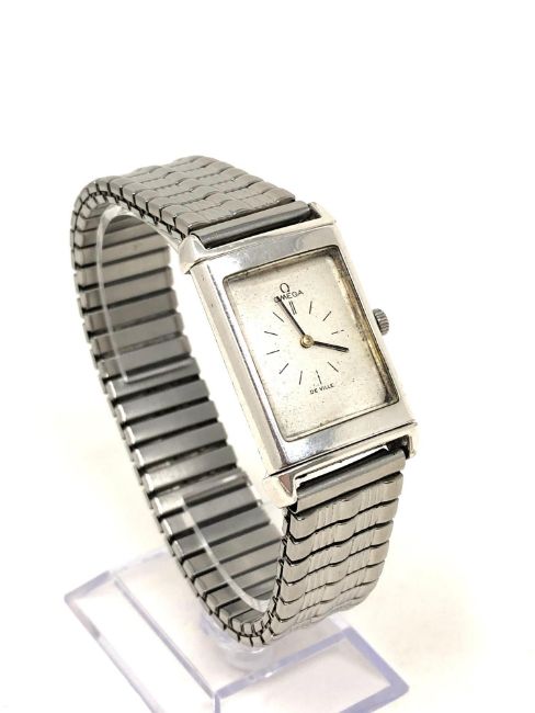 The revolving case has no markings. The inner case back has been polished to remove some serial numbers. The Omega movement appears genuine and is running. The dial is not a perfect fit for the case and moves slightly when the crown is turned. The case does not snap shut perfectly when turned over.