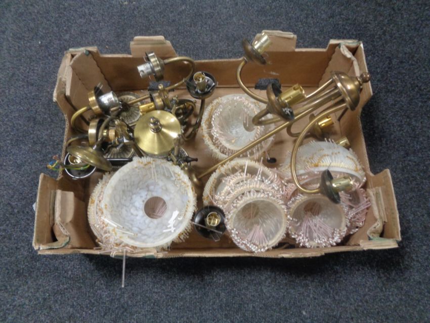 A box containing two brass ceiling lights together with four brass wall lights with glass tasseled shades.