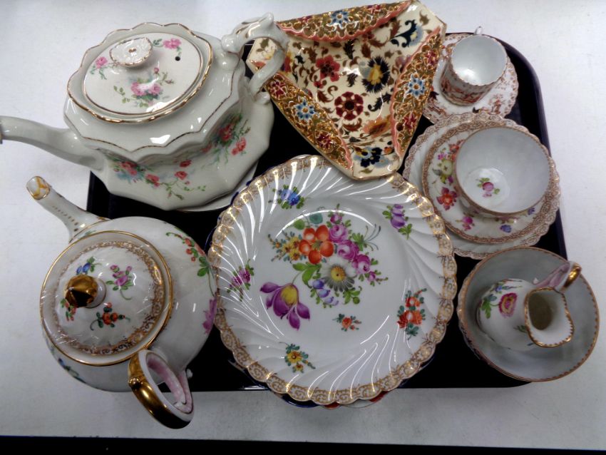 A tray containing antique and later china to include Dresden seven piece Tea for One, antique coffee can and saucer, Italian pottery bowl etc.
