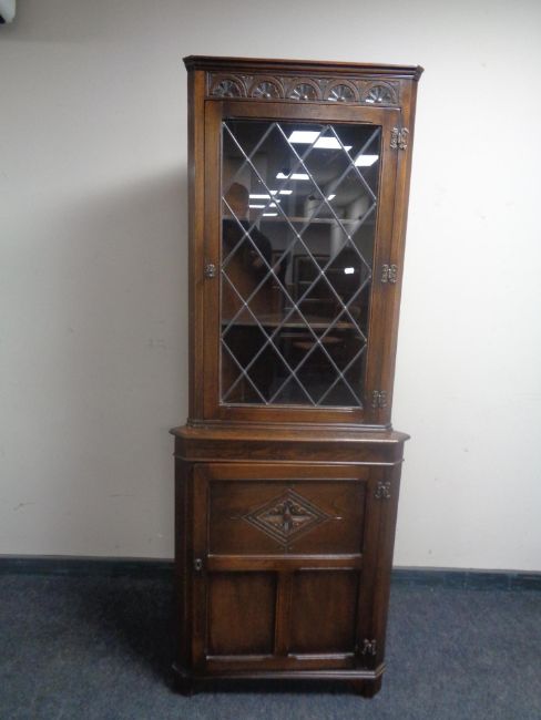 A good quality carved oak corner display cabinet with leaded glass door, fitted cupboard beneath