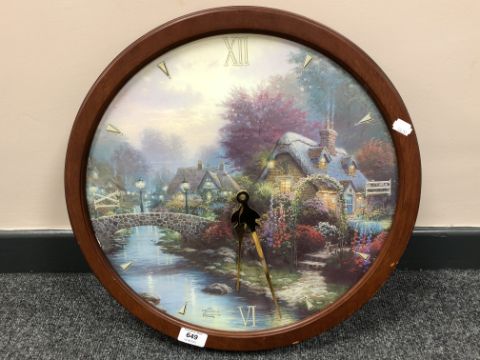After Thomas Kinkade (American, 1958-2012) : Lamp Light Bridge, a limited edition transitioning stained glass wall clock, limited edition issued by the Bradford Exchange, in a reproduction frame.