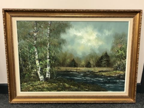 Jean Medina : Stream through woodland, oil on canvas, framed, 75 cm x 50 cm