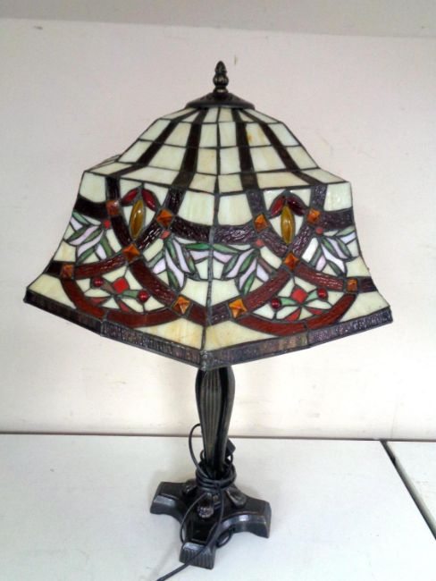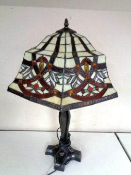 A cast iron table lamp together with a Tiffany style leaded glass shade.