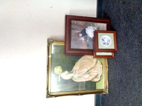 A brass framed arch topped mirror together with five further framed prints