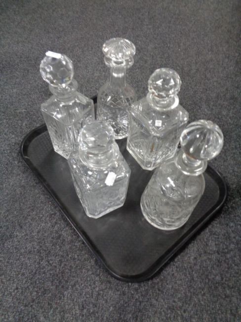 A tray containing five cut glass lead crystal decanters.