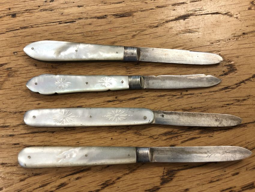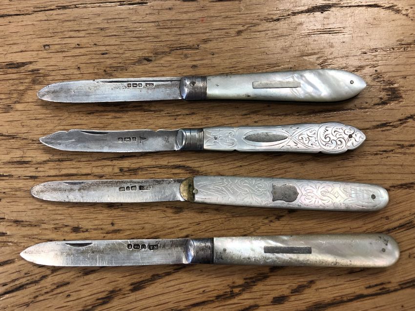 Four antique silver and mother of pearl handled fruit knives. (4)