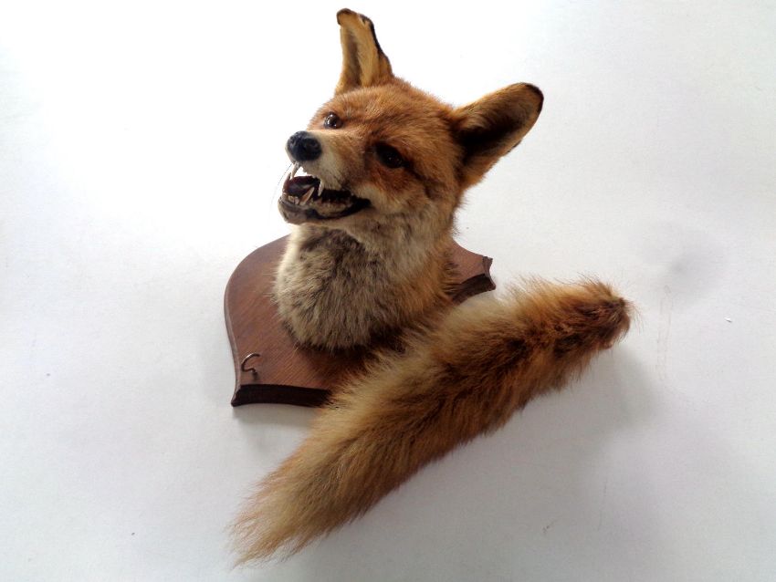 A taxidermy fox mask on shield with tail