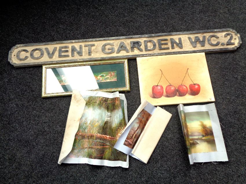 A wooden Covent Garden street sign together with a box containing unframed oil on canvas of cherries and two other canvases and a framed print