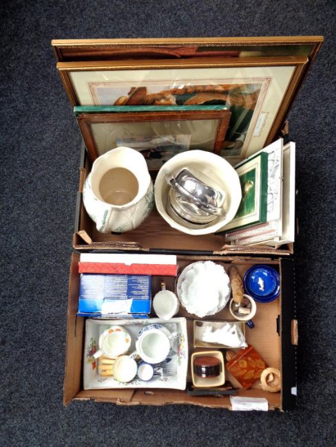 Two boxes containing miscellaneous to include antique pottery wash jug and transfer printed planter, fish cutlery, tea ware, pictures etc.