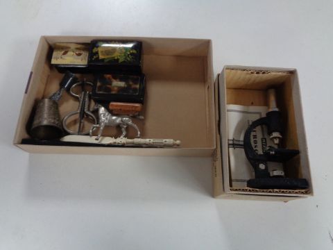 A box of treen snuff boxes, Merit student microscope, metal figure of a horse etc