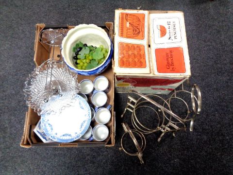 Two boxes of assorted glass ware, blue and white china to include Spode Italian mugs, planter, punch bowl and cups, glass comports