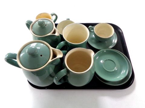 A tray containing 11 pieces of Denby stoneware, tea china, teapots, water jug etc.