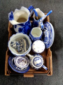 A box of antique and later blue and white wares to include wash jug, chamber pot, Ringtons china etc