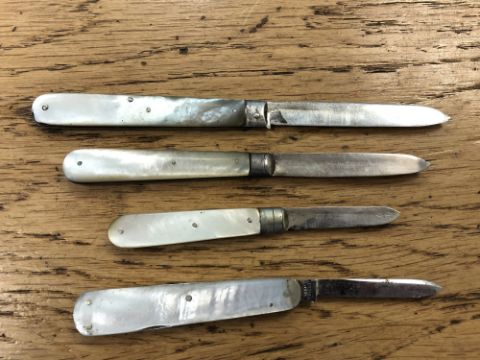 Three antique silver and mother of pearl handled fruit knives, plus one with stainless steel blade. (4)