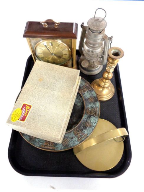 A tray of oil lamp, brass candlestick, cased cutlery, Metamec mantel clock