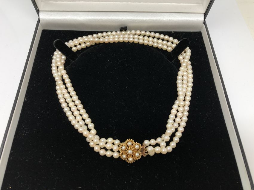 A triple strand cultured pearl necklace with gold clasp, length 37cm