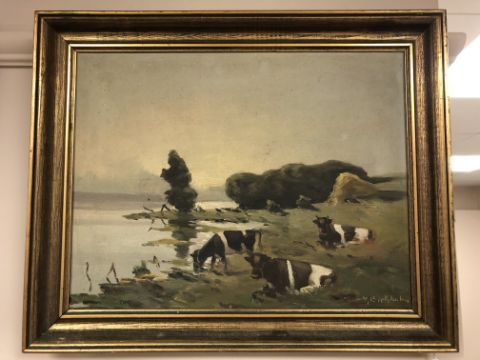 Continental school : Cattle watering, oil on canvas, 39 x 30 cm, indistinctly signed, framed.