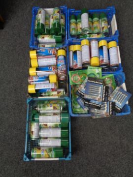 Seven plastic crates containing spray paints, rust proofers, twist wire door springs etc.