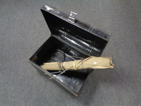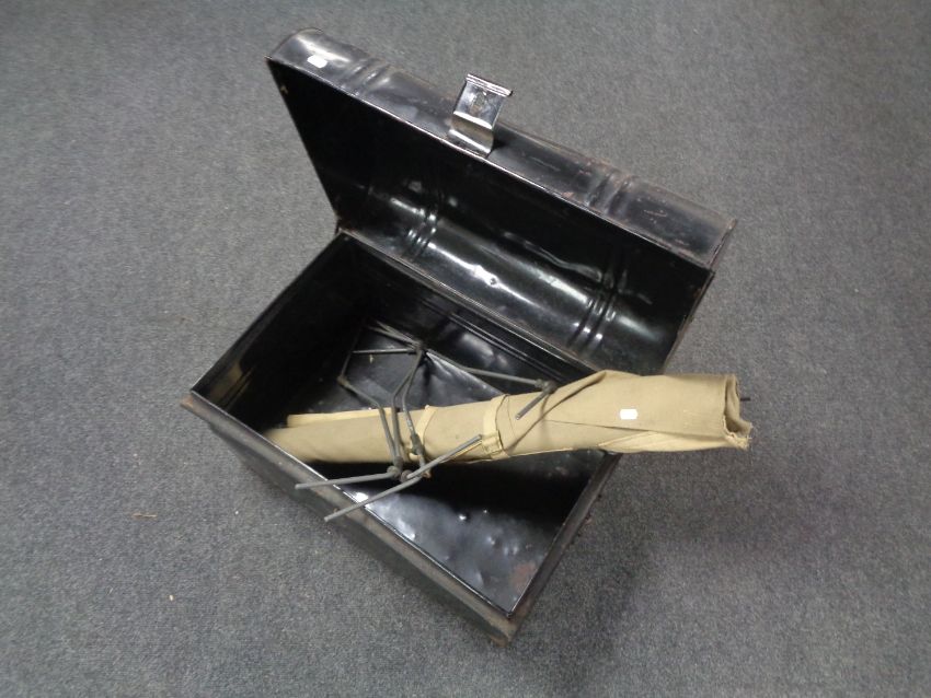 An early 20th century tin trunk together with a folding camp bed