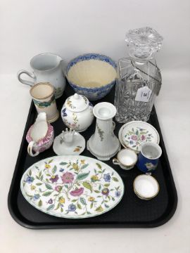 A tray containing crystal decanter, Aynsley lidded jar, Minton Haddon Hall trinket dish, antique sugar basin, miniature Royal Albert cup etc.