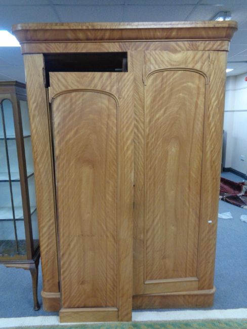 A Victorian satinwood double door wardrobe, fitted internal trays and drawers (as found).