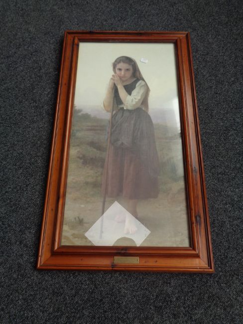 A box containing a collection of assorted contemporary framed prints, tapestries, mid 20th century print 'The Corridor'.