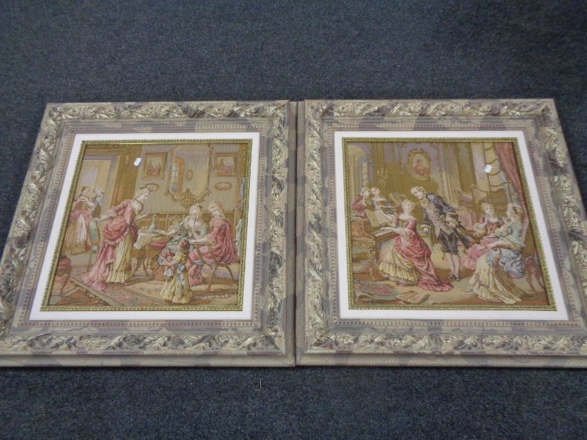 A pair of framed tapestries depicting 18th century parlour scenes