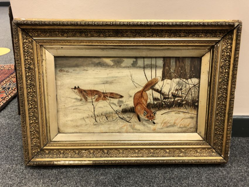L E Hopy : Two foxes in snow, oil on board, 42 x 23 cm, signed, framed.