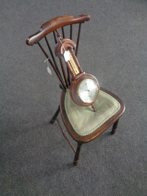 A beech spindle back bedroom chair together with a barometer with silver dial.