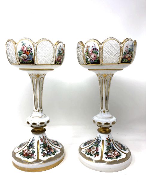 A good quality pair of Victorian hand painted gilded glass vases, height 32.5 cm.