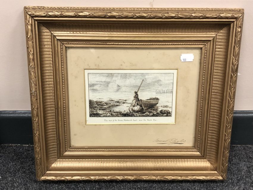 An antiquarian etching, 'The West of the Dunes, Warkworth Beach near the North Pier', 8 x 10 cm, indistinctly signed 'Ernest J Taylor?', framed.