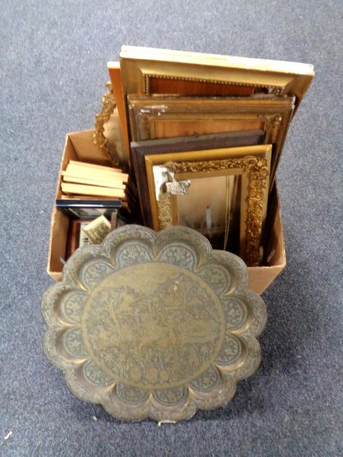 A box of assorted pictures - gilt composite frames, metal framed mirror, Eastern brass plaque